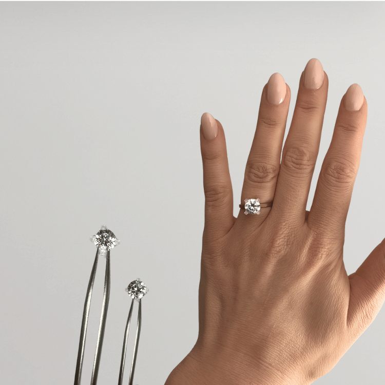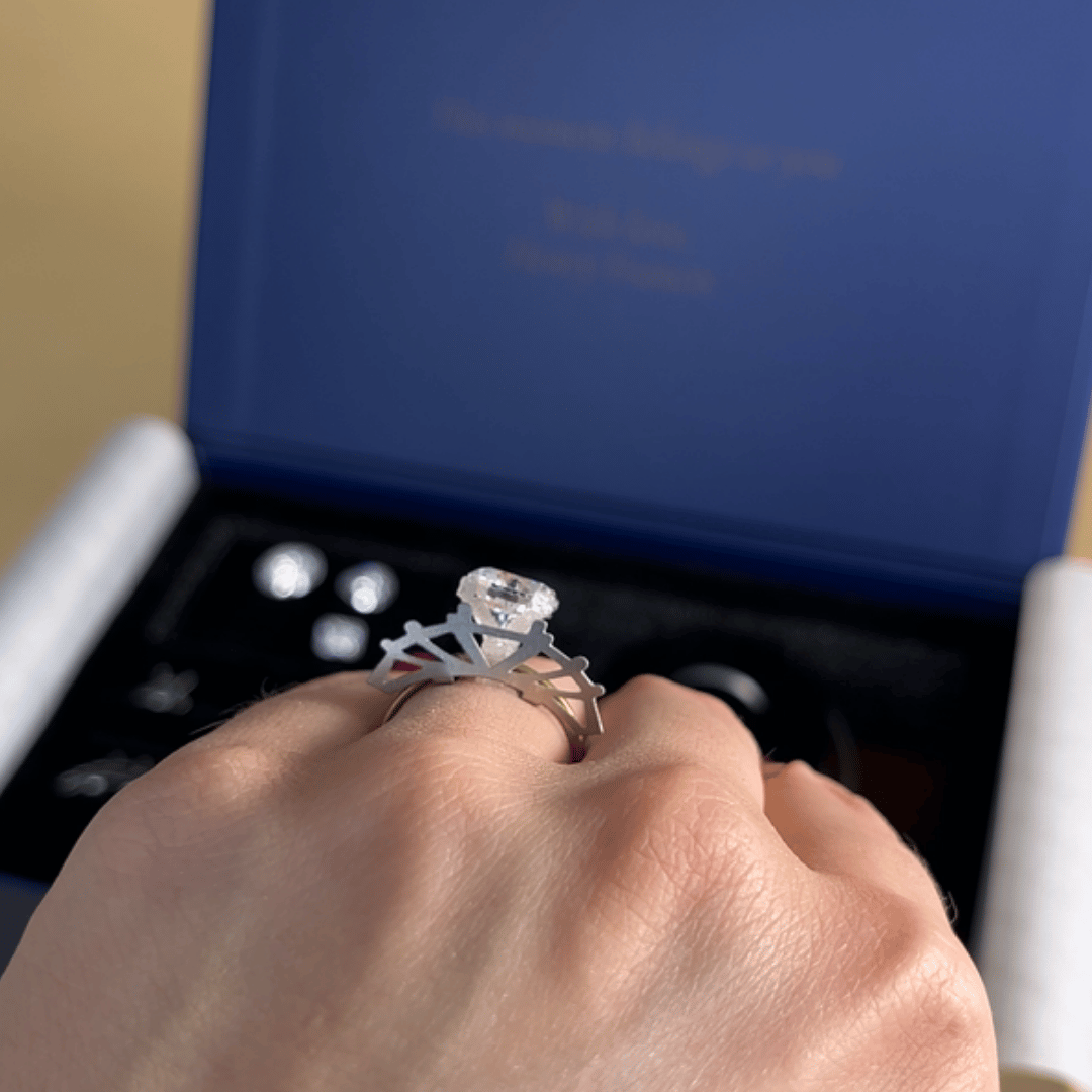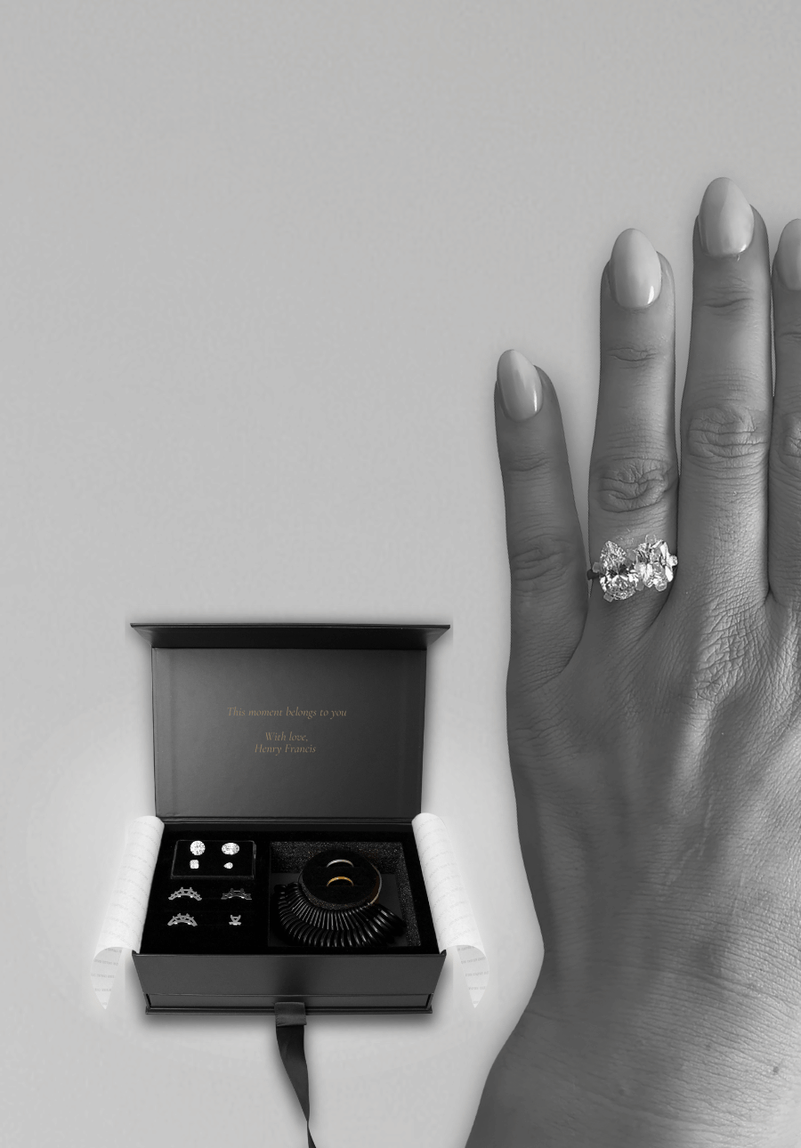 It’s a physical tool that lets you compare shapes, scale, and setting styles on your own hand, in your own space.