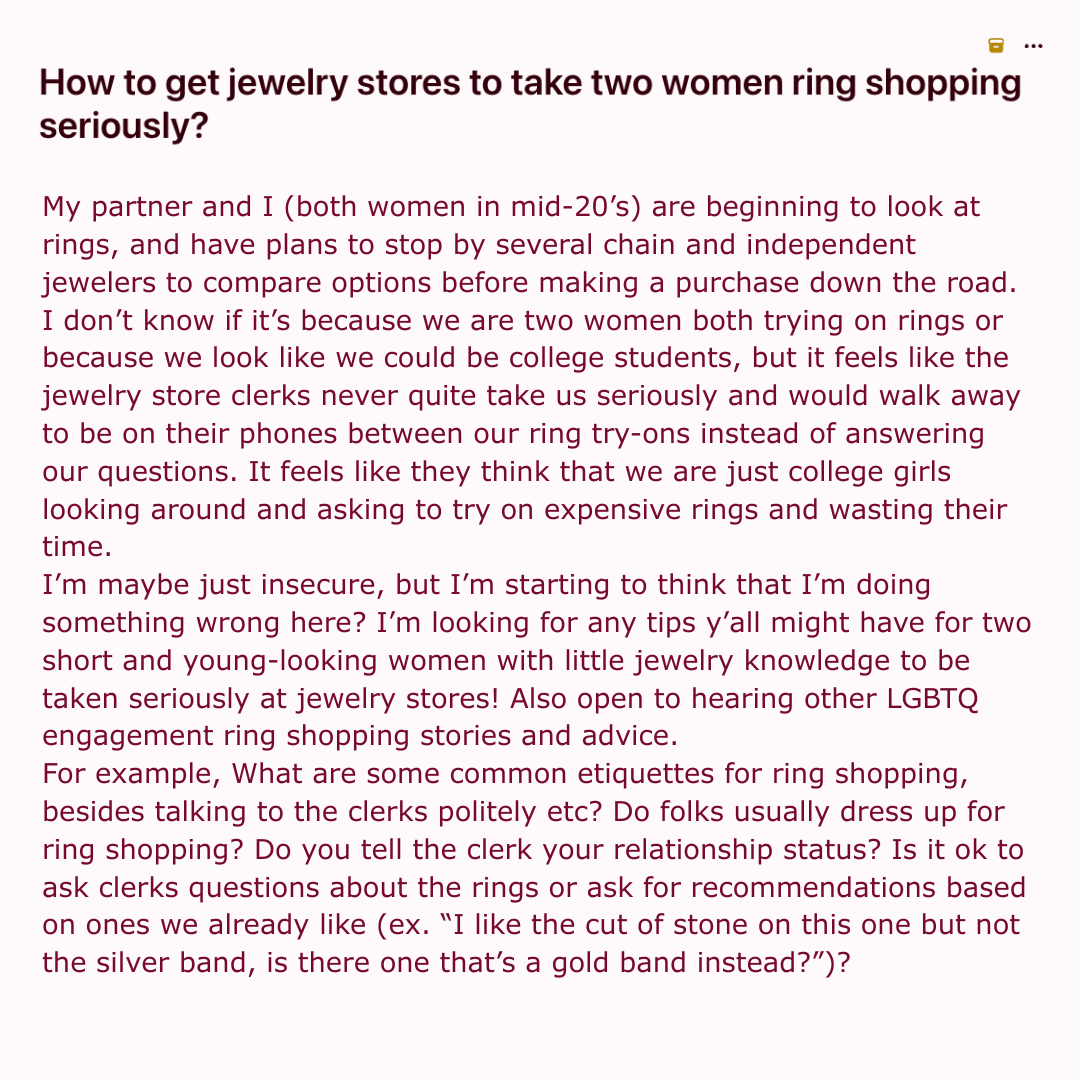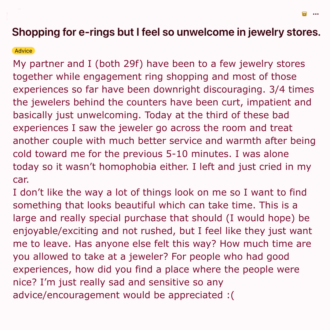 Compare combinations: Try stones and settings side-by-side to see what you’re truly drawn to. Compare shapes, sizes, and styles in real life, not from photos.